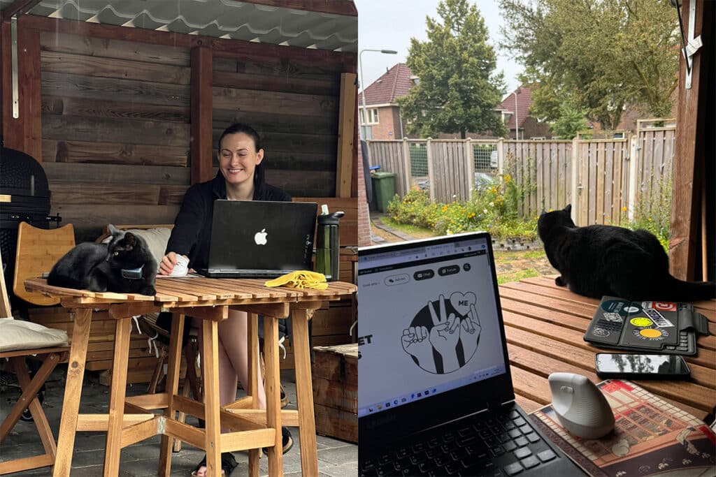 Het regent als we wakker worden, dus ik verplaats mijn office naar onder het afdakje buiten. Ik vind het echt een cadeautje dat ik lekker buiten kan zitten als het regent. Sop komt er direct gezellig bij liggen.