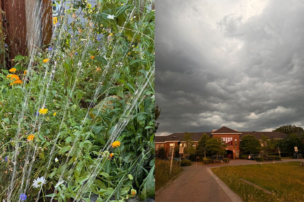 De avond begon en eindigde met water. Omdat het zo warm was en het gras toch nog water moest, renden mijn vriend en ik ook maar even door het water heen. Later op de avond fietste ik nog even langs de oppaskatjes en -hamster. ‘Ik denk dat je moet opschieten!’, appte mijn vriend toen ik net daar aankwam. De lucht was ineens zo donker! De ergste storm was ik gelukkig voor, maar ik moest onderweg wel echt uitkijken voor vliegende takken.