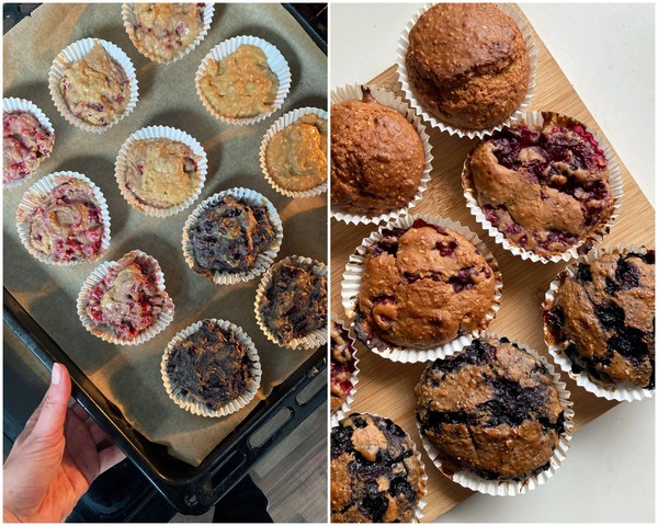 Alle ingrediënten voor muffins zijn nog in huis, dus waarom niet een nieuwe lading bakken? De muffin met blauwe bes blijkt favoriet. Dus die fruitsoort blijft erin, maar ik probeer het nu met havermout door het beslag en een vulling van pindakaas. Van dat laatste is zeker mijn vriend groot fan.