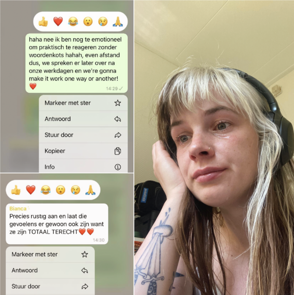 Slecht nieuws! Niet alleen de fotoshoot, maar ook het opnemen van de videoclip lijkt deze week niet door te kunnen gaan. De featuring artiest van de single, appt dat hij positief getest is op covid. Alles was al geregeld – een hele berg – en hoe moeten we ooit op tijd een nieuwe datum prikken in onze volle agenda’s?! We werken allemaal keihard – op ons werk, privé en aan de band – dat is veel en het geeft ook veel voldoening, maar als je net iets veel hooi op de vork hebt en ook een paar teleurstellingen moet verwerken, kan het even te veel worden. Ik heb in ieder geval even de ogen uit mijn kop moeten janken.