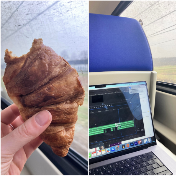 Na een dagje Leiden stap ik vandaag op de trein naar Amsterdam. We hebben een meeting met TikTok over hoe we kunnen samenwerken om TikTok veiliger te maken voor mensen met een eetstoornis. In de trein bewerk ik de podcast en ik ben echt in een croissantjesfase op het moment.