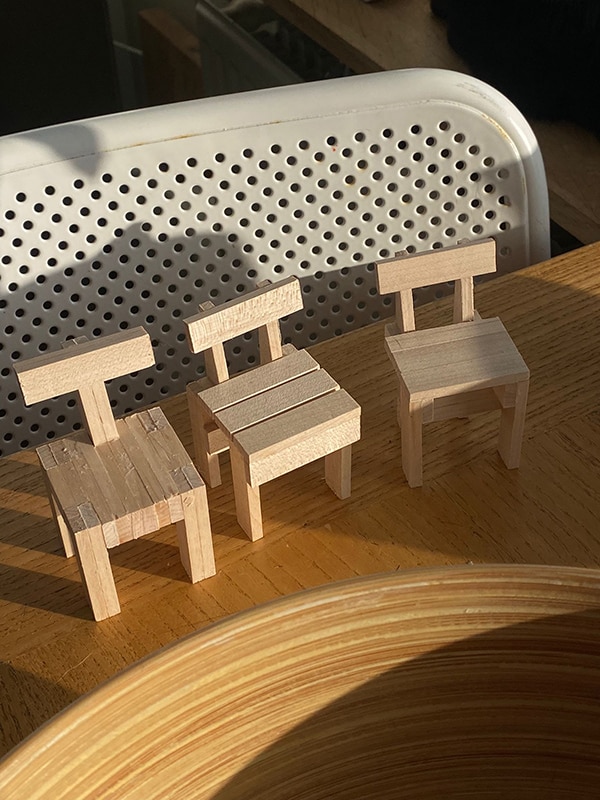 En nog een update in het kader van verhuizen: mijn vriend is bezig met het ontwerpen van eetkamerstoelen. Onze vensterbank staat inmiddels vol met prototypen.