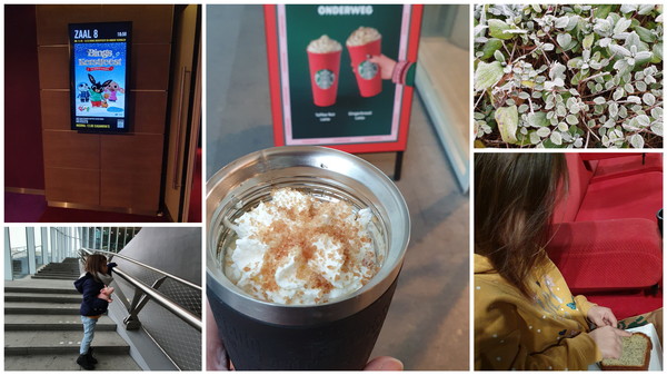 Vanochtend ging ik met Romy op date; we gingen voor het eerst naar de bioscoop! Met een lekkere kerstkoffie en een plakje cake gingen we zitten voor Bing het konijntje. Het was ontzettend fijn.