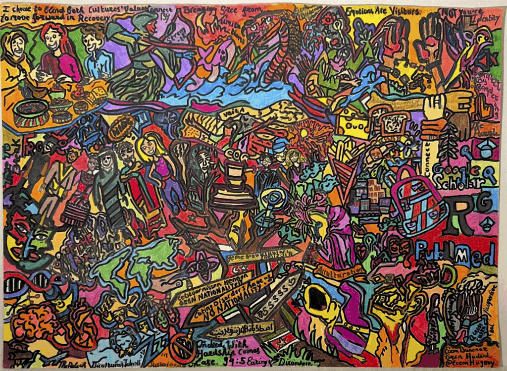 Dit kunstwerk heb ik gemaakt en gaat over het opgroeien met een eetstoornis tussen twee culturen. Het visualiseert de eenzame strijd met de eetstoornis, maar ook de veerkracht en rijkdom die mijn culturele opvoeding heeft geboden. Ik hoop hiermee wat erkenning en begrip te bieden, en vooral te laten zien dat je kwetsbaarheid ook je kracht kan zijn.